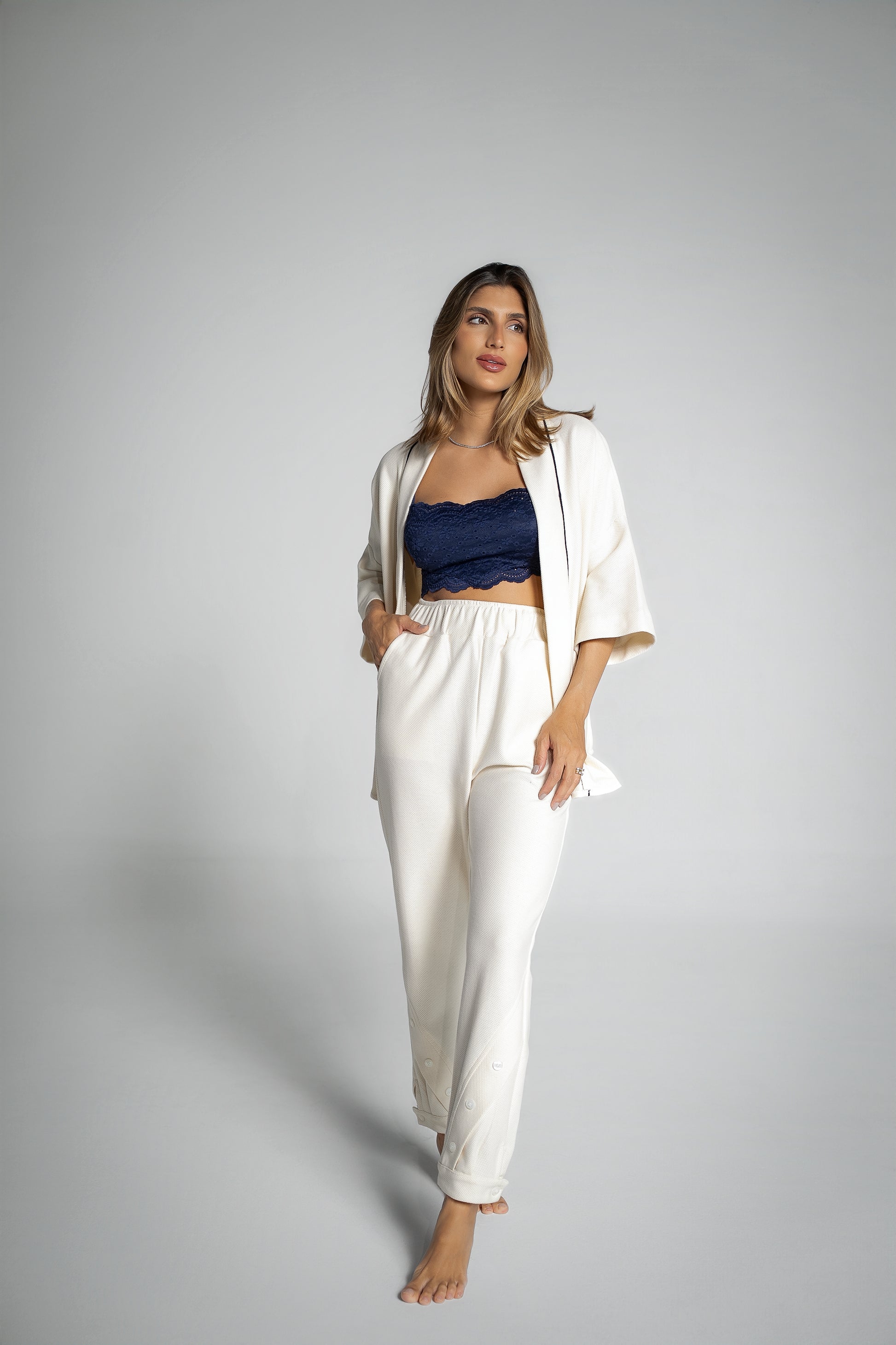 Redefina seu conceito de conforto com este conjunto em malha piquet na cor off-white. Com uma textura clássica em relevo e detalhes de alfaiataria moderna, esta peça foi desenhada para quem busca elegância descomplicada dentro e fora de casa.