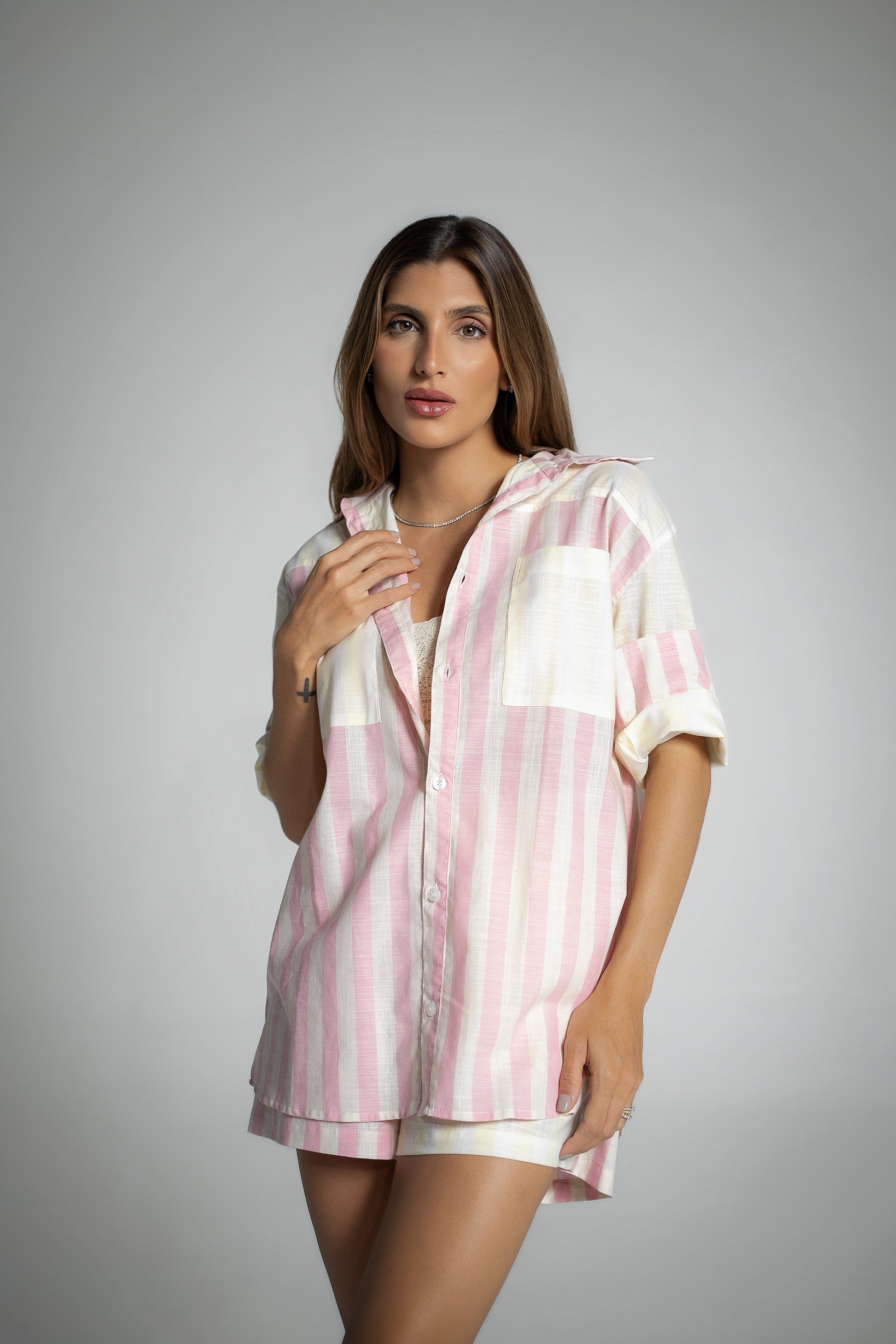 O frescor das listras em cada detalhe. Sinta a leveza de um pijama que abraça sua pele. Com uma paleta de cores suaves, 100% algodão, este conjunto une a sofisticação da camisaria com a liberdade que seus momentos de descanso pedem. As listras verticais alongam a silhueta, enquanto os bolsos funcionais e a modelagem soltinha garantem praticidade para as manhãs preguiçosas ou para um home office cheio de estilo. Porque você merece estar impecável, inclusive nos sonhos.