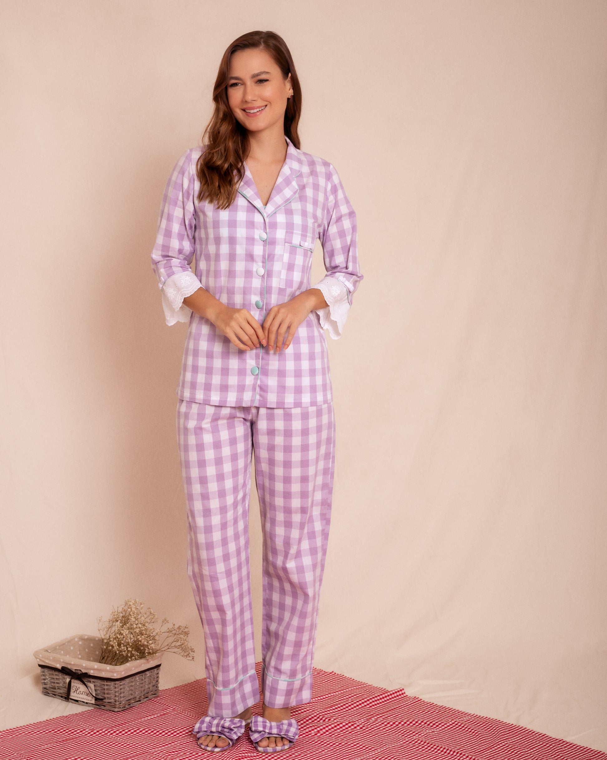 Pijama produzido com tecido 100% algodão e detalhes em renda.